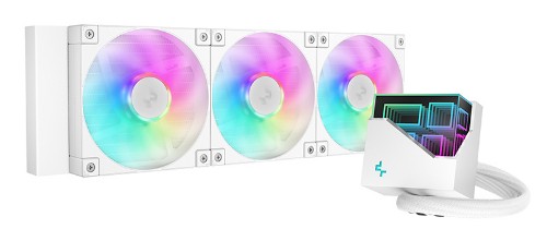 The LT360 WH ARGB is a high-performance liquid CPU cooler that has been upgraded to DeepCool's chart-topping 5th generation pump and provides strong heat dissipation power with a 360mm radiator, three precision-tuned FD12 ARGB fans, and a multidimensional infinity mirror top cap, presented in a clean all-white design.LT360 WH ARGBLET IT SHINE BRIGHT