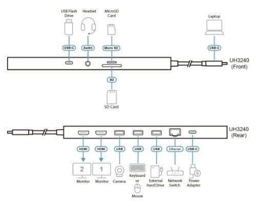 Transform your laptop into the ultimate workstation with unparalleled productivity.The UH3240 is a multiport dock that can expand up to 11 devices via a single USB-C cable. The myriad functions are packed into one light, compact dock, as you can charge your device, up to 100W, while transferring data at 5 Gbps.