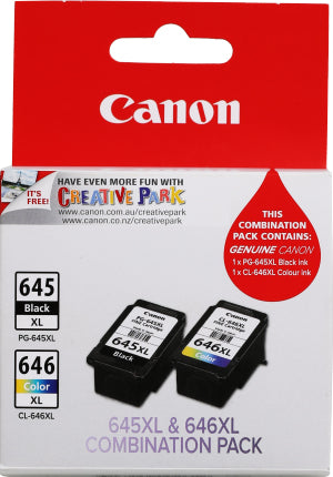 PG645XLCL646XLCP Combination Pack contains one PG-645XL Black Ink Cartridge and one CL-646XL Colour Ink Cartridge. Experience crisp, smudge-resistant professional quality text with the PG-645XL Black Ink Cartridge. This CLI-646XL Colour Ink Cartridge delivers improved colour, a wider colour gamut and better colour fastness. Print with genuine Canon ink and photo paper to achieve optimum results.Specifications