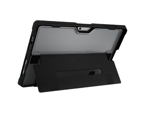 This sleek and rugged case has been designed to complement the Type Cover and Surface Pen while protecting your Microsoft Surface Pro. Our unique, transparent back panel allows the pristine beauty of your device to shine through. Slim and lightweight, yet super protective, the Dux Shell has been tested to meet or exceed U.S. Department of Defense 810G drop tests standards. we believe good enough isn’t good enough So, we make it a point to go above and beyond—even in the way we test our products. Military standards for drop testing require that a product like Dux be able to maintain all operating functions after plummeting 26 times for a height of 4 feet. We subjected Dux to our own extreme testing at 6.6 feet. It passed. And that calls for the best drop of all…a mic drop. our commitment to your comfort knows no limits Everyone has their own particular preference for what constitutes the ideal viewing incline when using their Surface. So, we went beyond the typical choice or two to give you the opportunity to find your perfect positioning. Our Infinity Stand is designed to accommodate nearly unlimited viewing angles in all modes (laptop, studio, and tablet). So, you can be a digital Goldilocks and choose the perspective that’s “just right” for you. we came up with the write way to store your surface pen Integrated and detachable storage (featuring a handy tether point) fastens your writing tool to the case while making it easily accessible. A simple innovation that’s simply brilliant. if you’re looking to make a case all your own, the choice is clear We use completely transparent materials for our back panel that allow you to customize your device with personal images, scan a tagging barcode, or simply let the beauty of your device shine through. But there’s one more thing we want to make perfectly clear: this stylish case still provides the maximum level of protection for your digital gear.Specifications