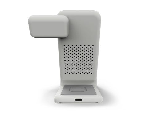 A wireless charging stand that rejuvenates three devices at once. Slim and sleek, with a small footprint that takes up minimal space on a desk or nightstand.Specifications