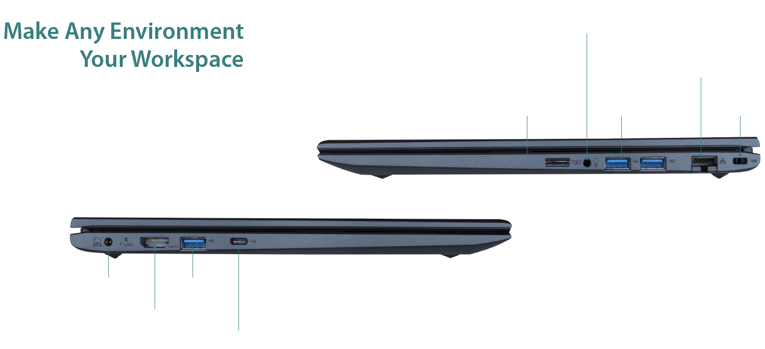 3x USB 3.2 Type-A, 1x USB 3.2 Type-C™ Gen 2 (supporting power delivery, data transfer and display), HDMI-out, RJ-45, headphone/microphone combo, MicroSD card reader